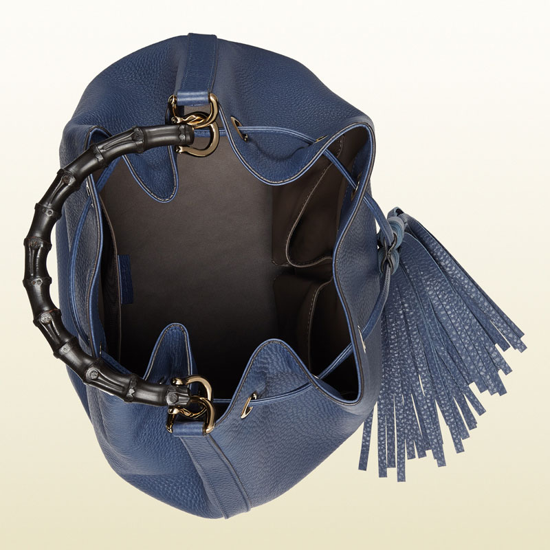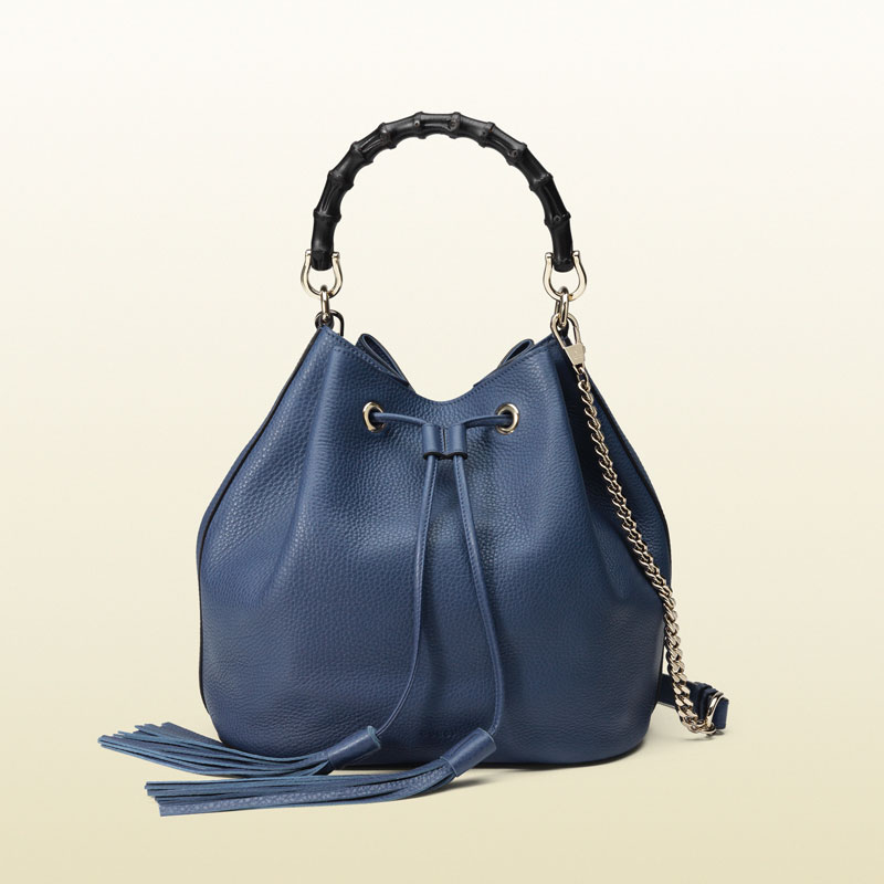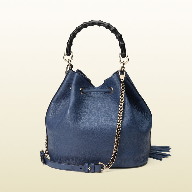 the new heroine of your handbag collection. multi-functional with room to spare, our structured bucket bag boasts a beautiful bamboo handle and a striking chain strap. made in one of signature leathers, noted for its incredible softness, elasticity and light weight.