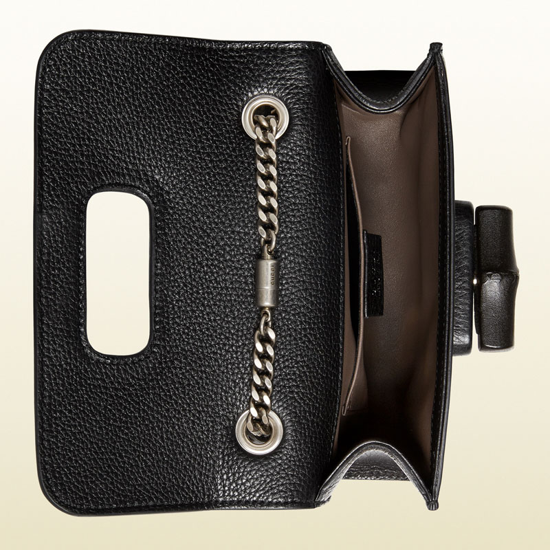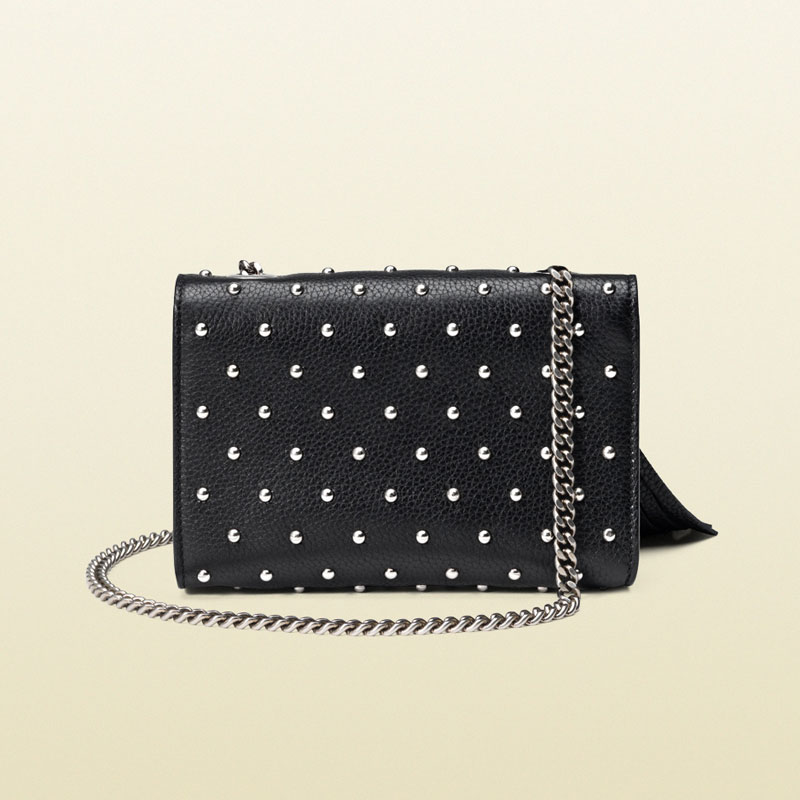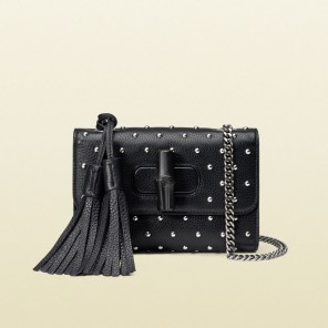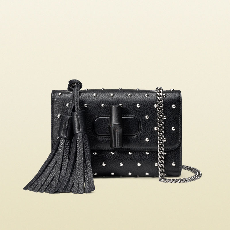 a beautifully structured silhouette accented by a striking chain shoulder strap and a dark lacquered bamboo closure detail. the studs add a touch of spunk without giving up its sense of elegance. made in one of signature leathers, noted for its incredible softness, elasticity and light weight.