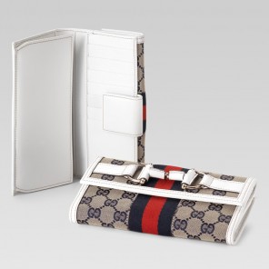 - beige/blue GG fabric with white leather trim and blue/red/blue signature web