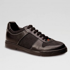 - black leather with black GG fabric trim- gucci laces with signature web loop- round toe- rubber sole