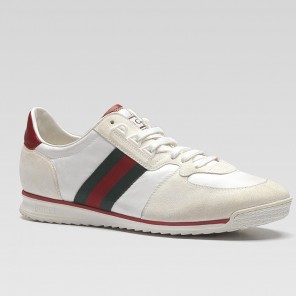 - white nylon and white suede with beige/green/red web and red leather trim- rubber sole- we recommend sizing down a half size