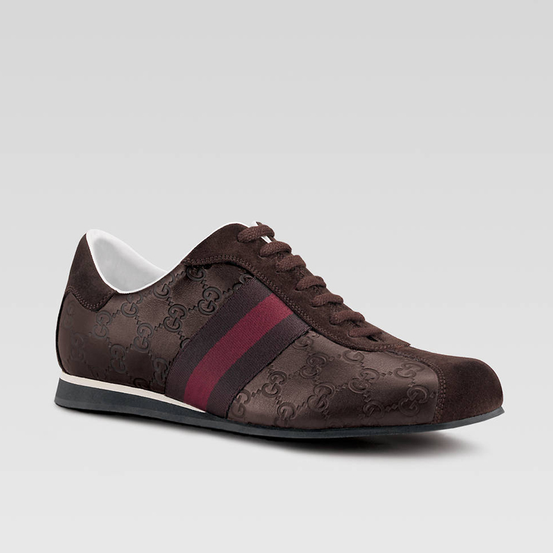 - chocolate guccissim leather- brown/red/brown web- round toe- rubber sole