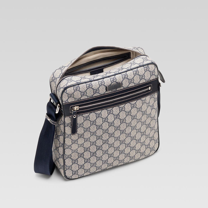 - beige/blue GG plus with blue leather trim - nickel hardware - adjustable shoulder strap - zip-top closure - front zip pocket and inside pocket