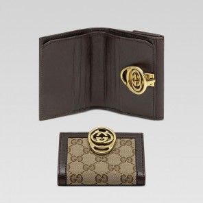 -beige/ebony GG fabric with brown leather trim/interior-brass hardware-snap closure-six card slots and one bill compartment-coin pocket