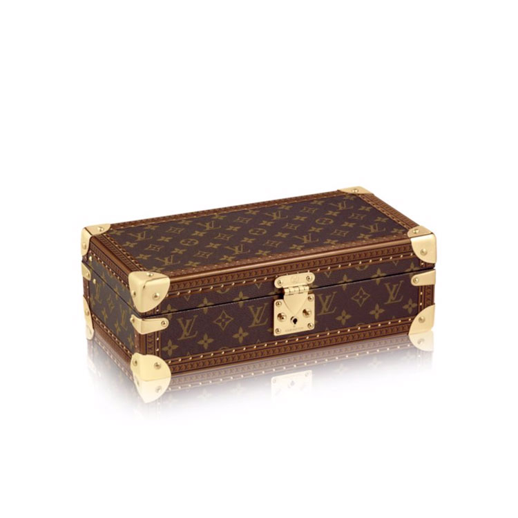 This 8 watch case is crafted in classic Monogram canvas. It easily goes from safe to suitcase and has a removable tray to hide other valuables.