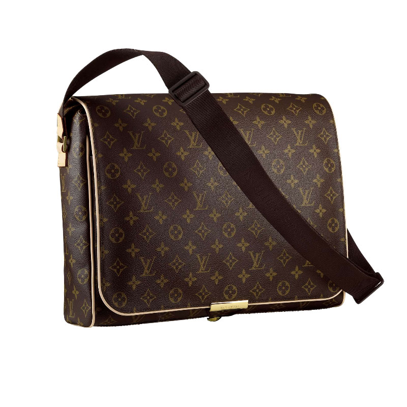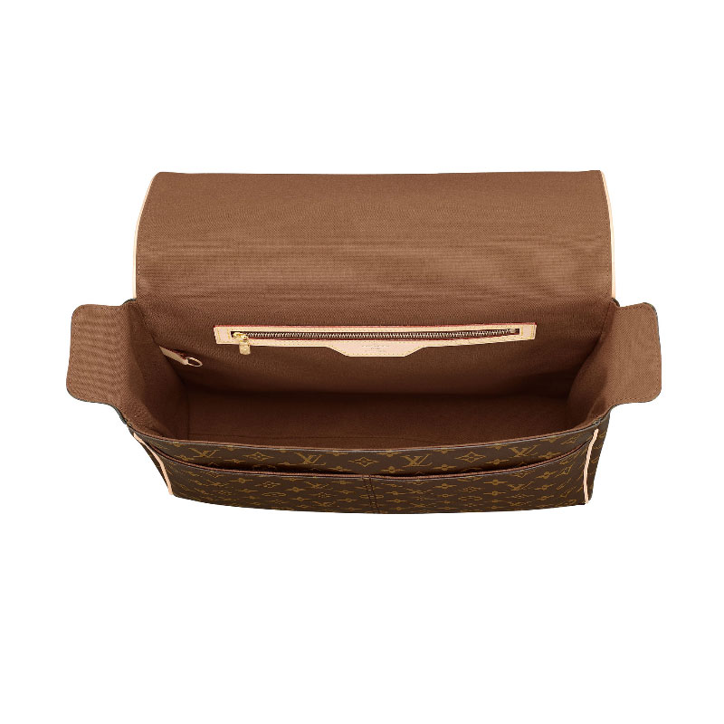 - Monogram canvas, leather trim, adjustable textile strap, brown canvas lining