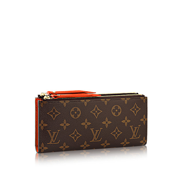 Combining Louis Vuitton's iconic Monogram canvas with a brightly coloured leather lining, the stylish Adele wallet has a modern, slim-line design with two leather zippers and a magnetized button for easy opening. It can also be carried as a clutch.