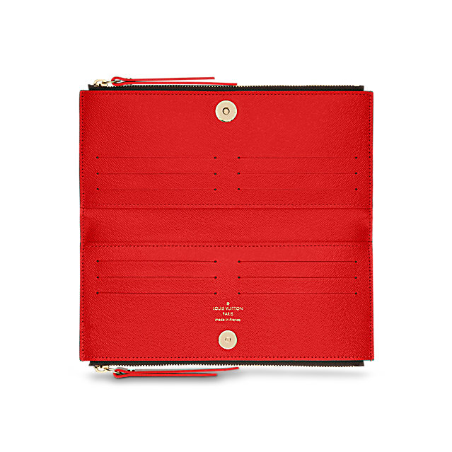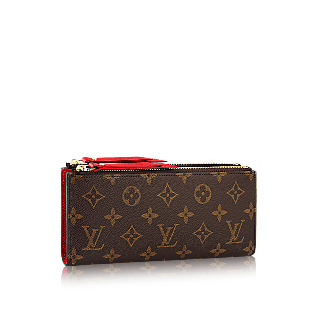 Combining Louis Vuitton's iconic Monogram canvas with a brightly coloured leather lining, the stylish Adele wallet has a modern, slim-line design with two leather zippers and a magnetized button for easy opening. It can also be carried as a clutch.