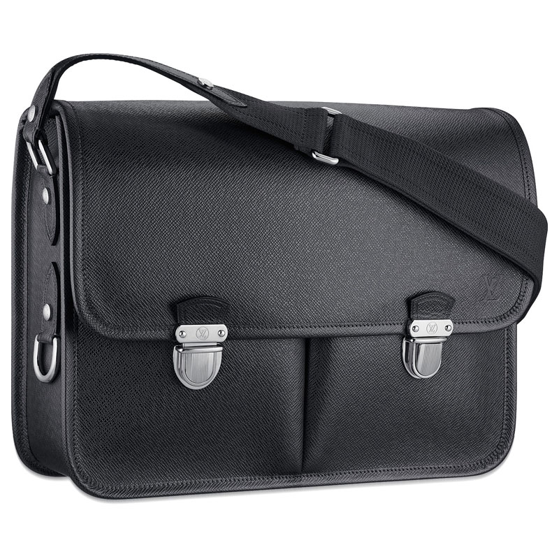 This ample bag can easily hold a laptop or A4 format documents. It comes in Taiga leather, can be carried on the shoulder or across the body and features two press lock closures.