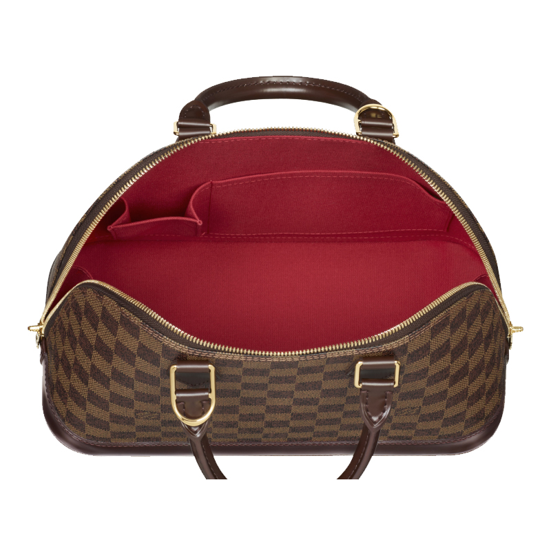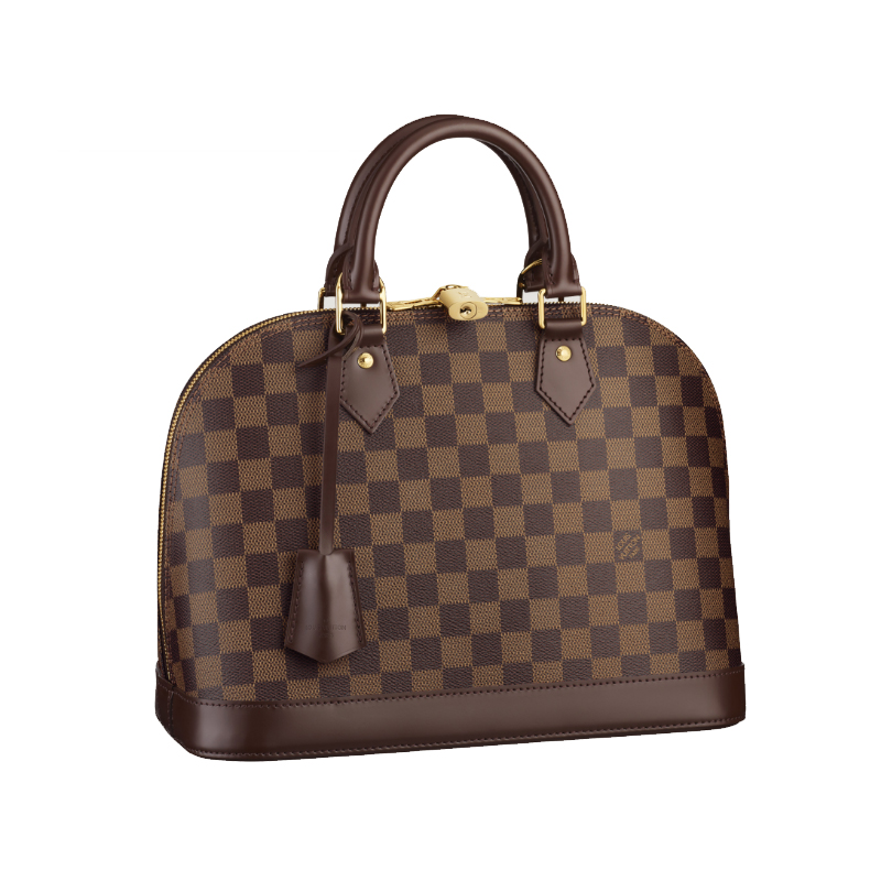 A true Louis Vuitton icon,the Alma looks chic and feminine in understated Damier canvas. Its elegant curved shape,shiny golden brass details and smooth leather trimmings embody classic city style.