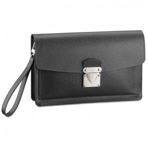 Part of the Taiga leather range, this pouch, with removable wrist strap, is compact, but can easily hold essentials such as PDA, keys and check book. It closes with a stylish LV engraved press lock.