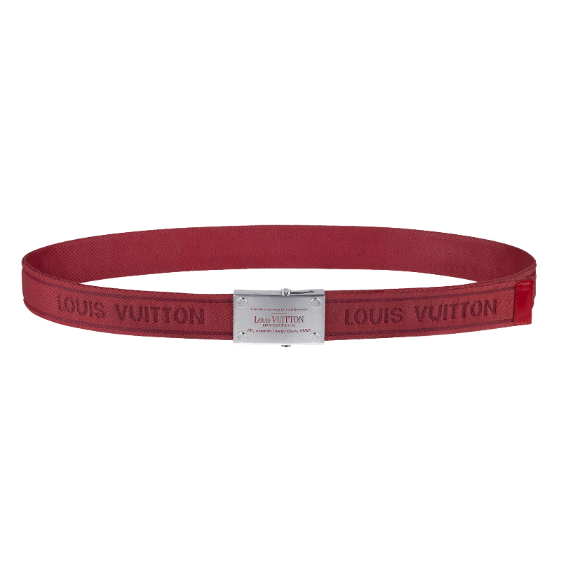 This casual belt in high-quality cotton webbing, woven with the Louis Vuitton signature, features an easy-closing buckle inspired by the historic "Louis Vuitton Inventeur" plaque dating back to 1875.