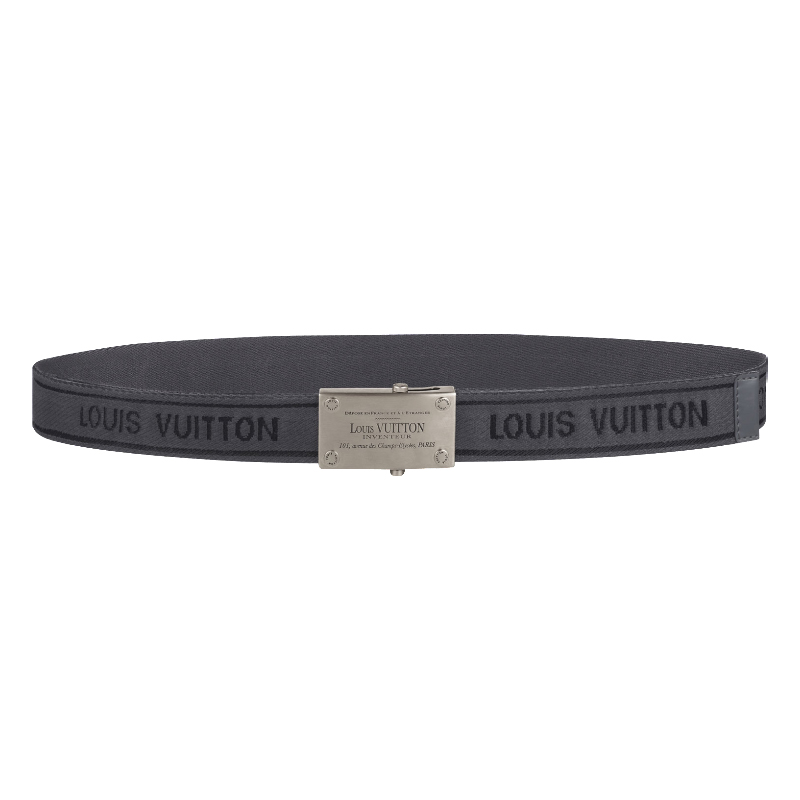 This casual belt in high-quality cotton webbing, woven with the Louis Vuitton signature, features an easy-closing buckle inspired by the historic "Louis Vuitton Inventeur" plaque dating back to 1875.