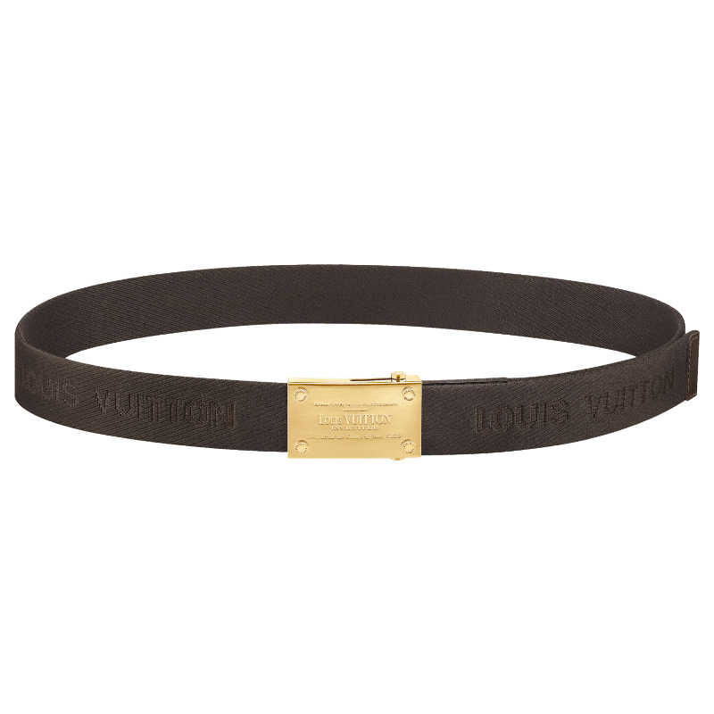 This casual belt in high-quality cotton webbing, woven with the Louis Vuitton signature, features an easy-closing buckle inspired by the historic "Louis Vuitton Inventeur" plaque dating back to 1875.
