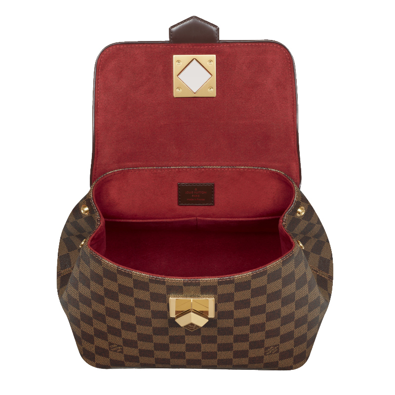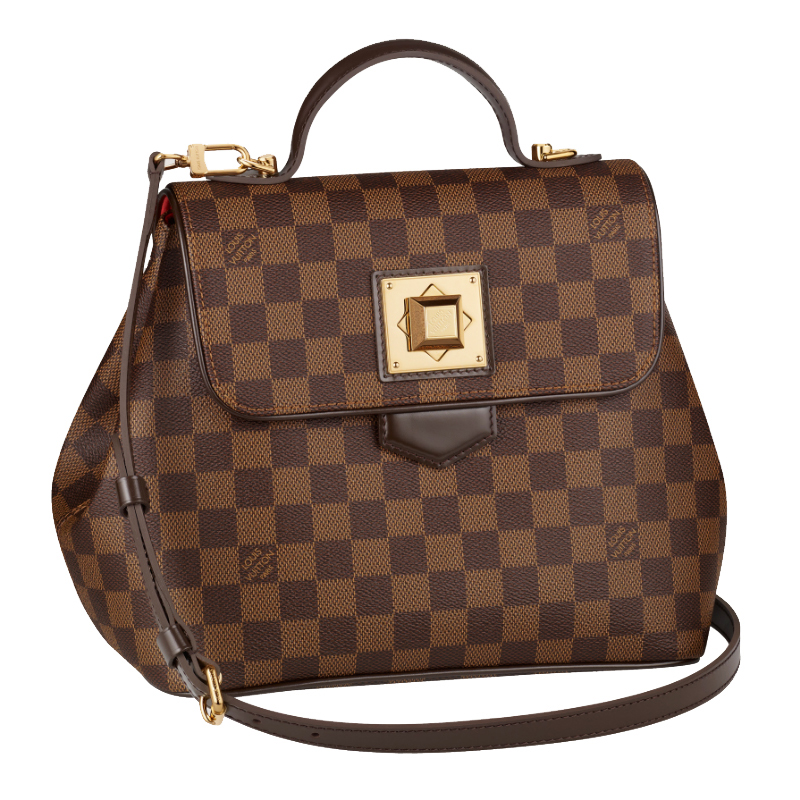 In understated Damier Ebene canvas, The Bergamo PM epitomises retro chic. Soft feminine pleats and an eye-catching golden brass twist lock beautifully complement its glamorous shape.