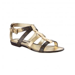 Louis Vuitton's iconic Monogram canvas is teamed with shiny gold leather on these eye-catching flat sandals, which combine comfort with up-to-the-minute summer style.