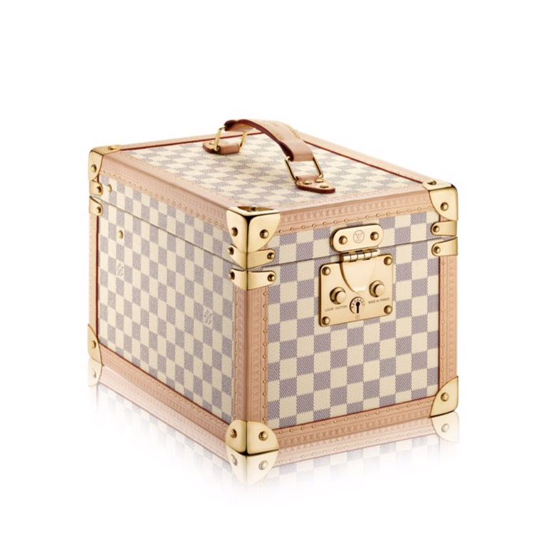 This Damier Azur vanity case is the ultimate travel companion. It features a removable compartment and a cover with a mirror and S-lock.