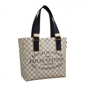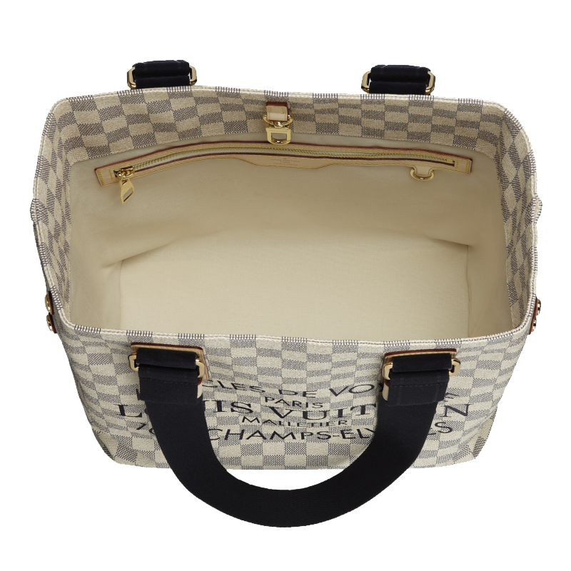 Adorned with a vintage Louis Vuitton advertisement,and in fresh and feminine Damier Azur canvas,the Cabas PM is epitome of carefree city style,shiny golden brass pieces complete its rich look.