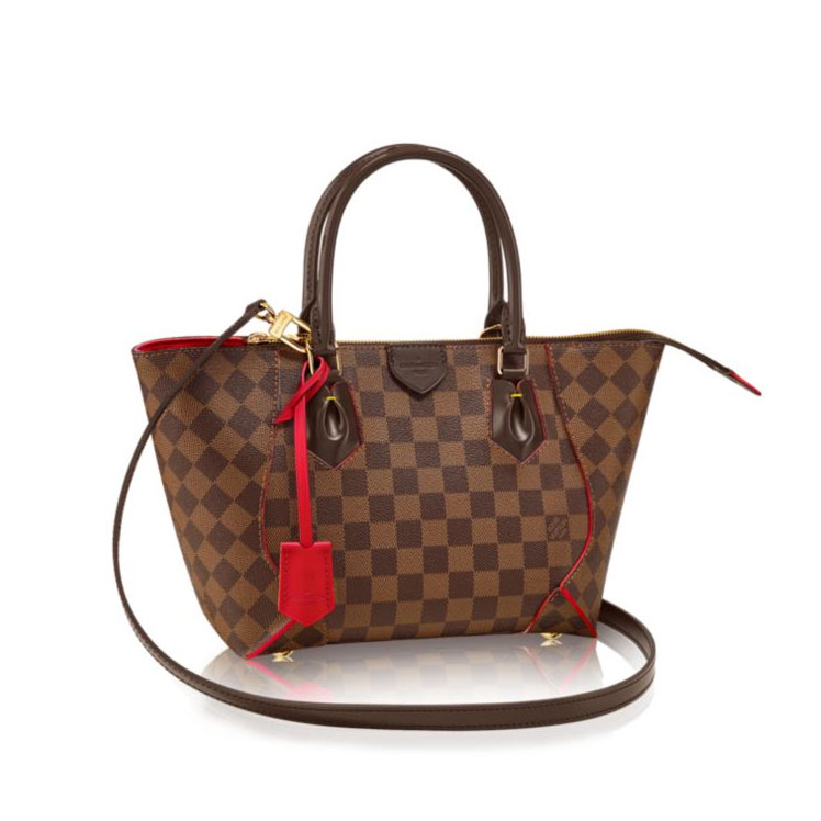 Caissa, this new tote in Damier Ebene, is named in homage to the goddess of chess as a subtle wink to the Damier pattern. The bag displays a sophisticated silhouette of strong, modern lines softened by delicate curves. Contrast-edge dyeing and leather accents in bold colors lend a colorful touch. Heritage details include an embossed leather patch inspired by classic Vuitton trunk drawers, hand-stitching and refined gold-tone hardware. The Ca?ssa Tote PM comes with a removable strap.