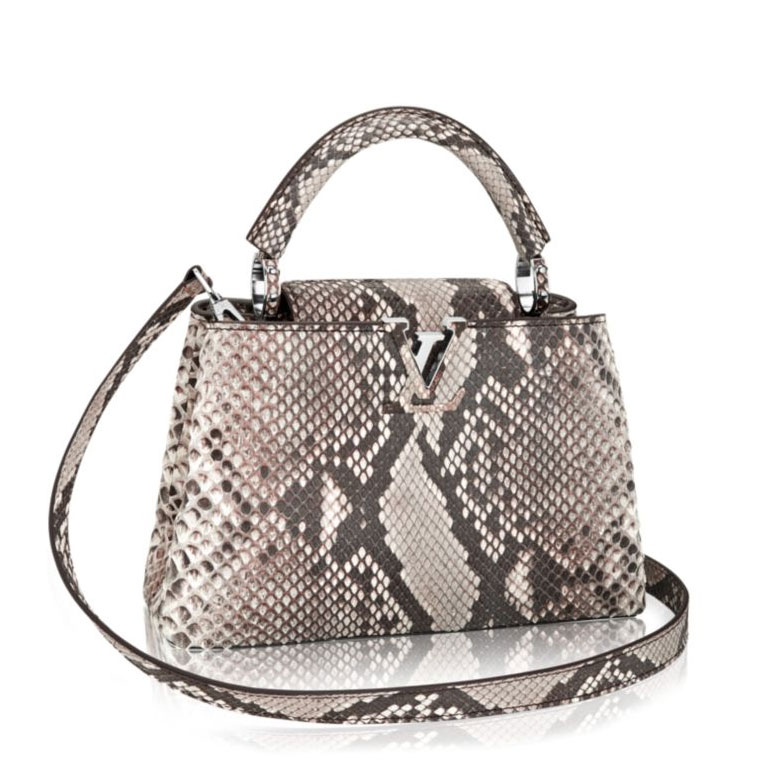 This version of the iconic Capucines bag in precious python leather is really two exquisite bags in one: wear it with the flap outside to feature the Monogram-inspired flower or tuck the flap inside to show off the modern new LV signature.