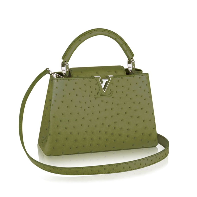 Taking its name from the rue des Capucines in Paris, where Louis Vuitton opened his first store in 1854, the Capucines bag is a testament to exceptional leather craftsmanship. In rare and precious ostrich skin, it combines refined details, including a semi-rigid handle secured by jewel-like rings, with a spacious, functional shape. Its distinctive flap can be worn in two ways: outside to reveal the outline of a Monogram flower, or inside to show the LV initials.
