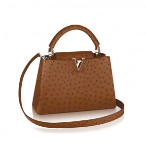 Taking its name from the rue des Capucines in Paris, where Louis Vuitton opened his first store in 1854, the Capucines bag is a testament to exceptional leather craftsmanship. In rare and precious ostrich skin, it combines refined details, including a semi-rigid handle secured by jewel-like rings, with a spacious, functional shape. Its distinctive flap can be worn in two ways: outside to reveal the outline of a Monogram flower, or inside to show the LV initials.