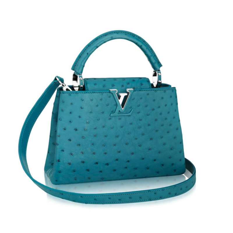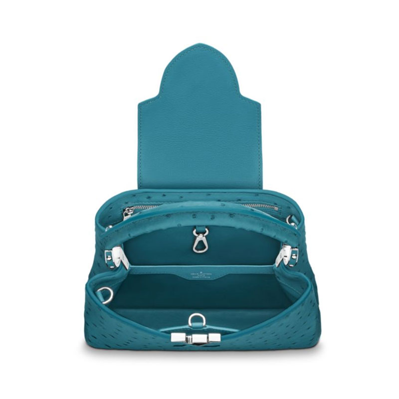 Taking its name from the rue des Capucines in Paris, where Louis Vuitton opened his first store in 1854, the Capucines bag is a testament to exceptional leather craftsmanship. In rare and precious ostrich skin, it combines refined details, including a semi-rigid handle secured by jewel-like rings, with a spacious, functional shape. Its distinctive flap can be worn in two ways: outside to reveal the outline of a Monogram flower, or inside to show the LV initials.