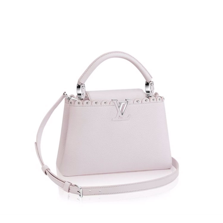 This fashionable Capucines BB is softened by a delicate and feminine cut inspired by the lace croquets technique. The chiseled edges, with a precious stud at their center, are inspired by the iconic Monogram Flower and by the nails on historic House Trunks.