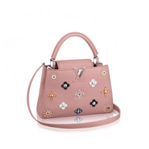 The Capucines BB Mechanical Flowers in Magnolia reinterprets the iconic Monogram Flowers in a modern version for a bold allure. The mettalic studs represent the hearts of the flowers and give a rock touch to the bag. They also remind the nails which were used to stretch the Monogram canvas on the historical Louis Vuitton's trunks. this delicate animation crosses different universes and codes of the House in a feminine way.