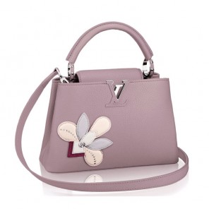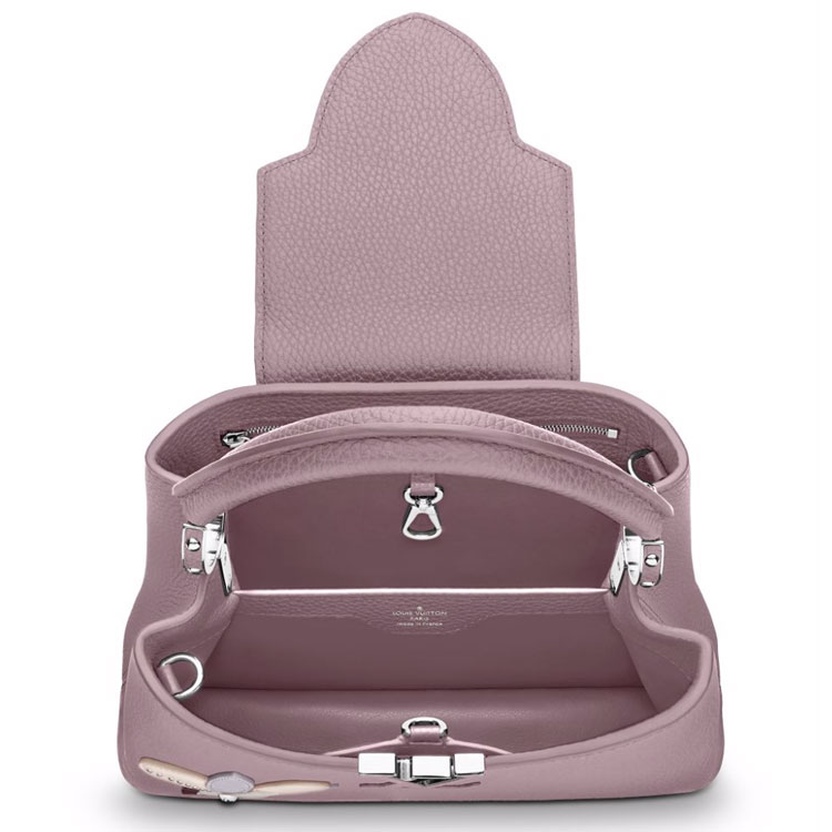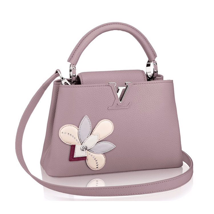 The iris is a talisman for the Vuitton family, present in the garden and ancestral home at Asni猫res. This season, the House adorns the Capucines PM in Tourterelle Taurillon with a delicate floral jewel: an iris blossom crafted of leather petals and golden metal studs..