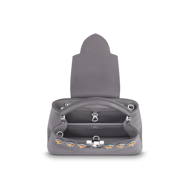 The sweet Japanese treats known as “hanami” inspired the ultra-feminine details on this new Capucines model. The Monogram Flower is rendered in satin, lambskin and colorful beads, for a fresh, playful look that is totally in tune with spring silhouettes.