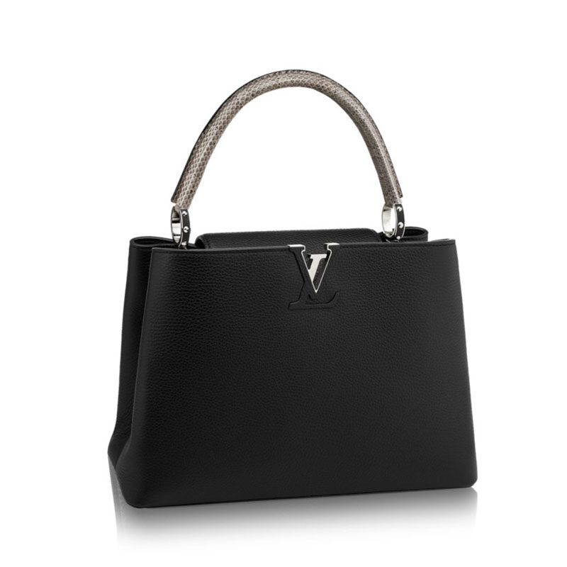 It was on the Rue des Capucines in Paris that the first Louis Vuitton store opened its doors. As timeless as the House itself, the Capucines bag brings chic sophistication to any look. Full-grain Taurillon leather combines with precious python ayers to create a luxurious handbag accented with heritage details: the LV initials, the distinctive side rings and the subtle Monogram flower on the closing flap. Its capacious interior makes the bag an ideal companion for a day of business or shopping.
