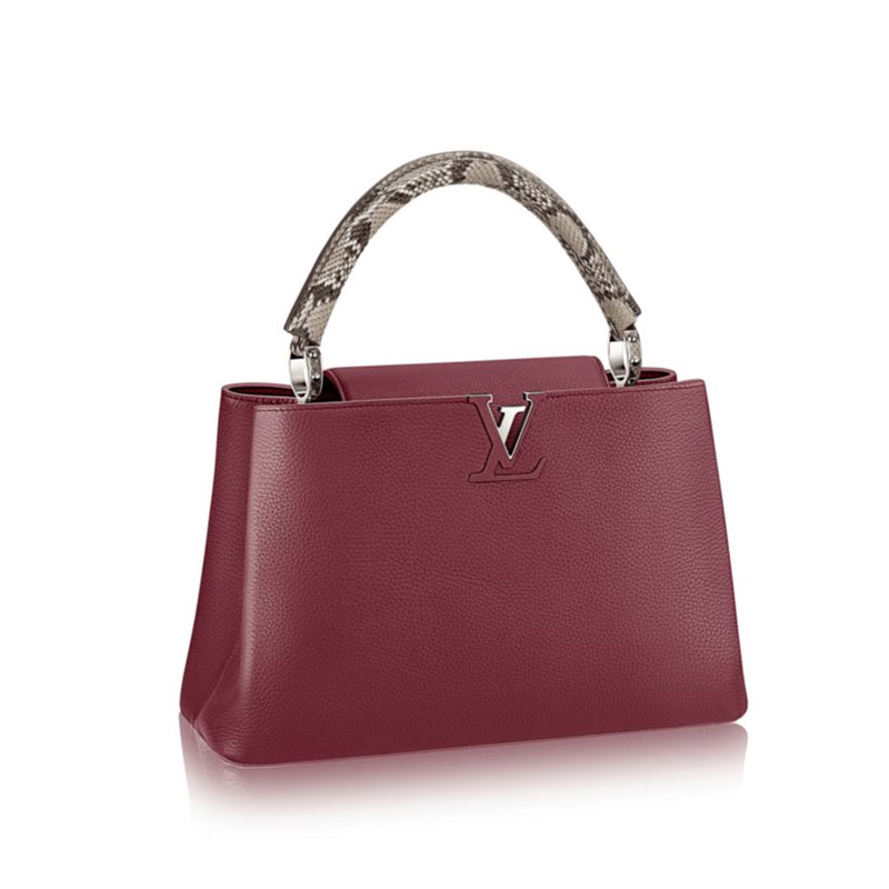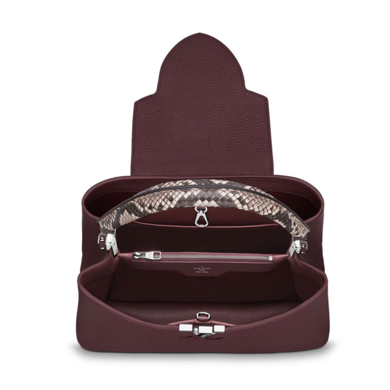 It was on the Rue des Capucines in Paris that the first Louis Vuitton store opened its doors. As timeless as the House itself, the Capucines bag brings chic sophistication to any look. Full-grain Taurillon leather combines with precious python ayers to create a luxurious handbag accented with heritage details: the LV initials, the distinctive side rings and the subtle Monogram flower on the closing flap. Its capacious interior makes the bag an ideal companion for a day of business or shopping.