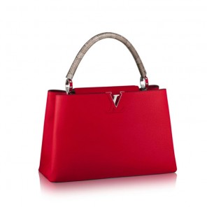 It was on the Rue des Capucines in Paris that the first Louis Vuitton store opened its doors. As timeless as the House itself, the Capucines bag brings chic sophistication to any look. Full-grain Taurillon leather combines with precious python ayers to create a luxurious handbag accented with heritage details: the LV initials, the distinctive side rings and the subtle Monogram flower on the closing flap. Its capacious interior makes the bag an ideal companion for a day of business or shopping.