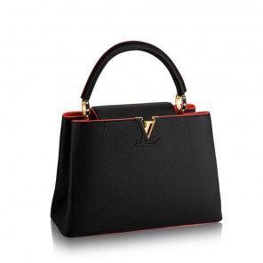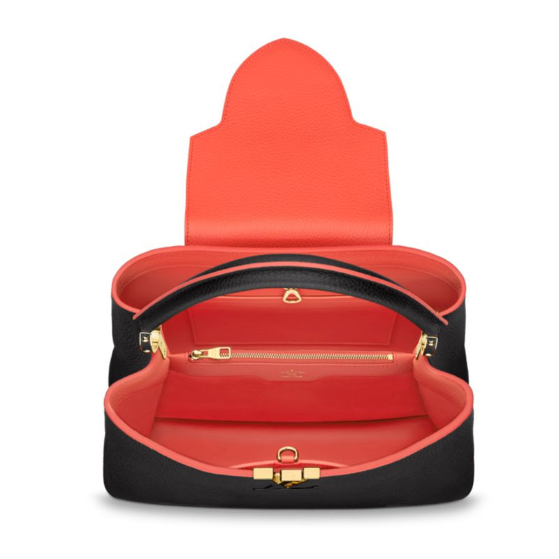 Taking its name from the Rue des Capucines in Paris, where Louis Vuitton opened his first store in 1854, the timelessly elegant Capucines bag is a testament to fine leather craftsmanship. In full-grain Taurillon leather, it combines refined details, including a semi-rigid handle secured by jewel-like rings, with a spacious and functional shape offering two inside compartments. Its distinctive flap can be worn two ways: outside to reveal the outline of a Monogram flower, or inside to show the LV initials.