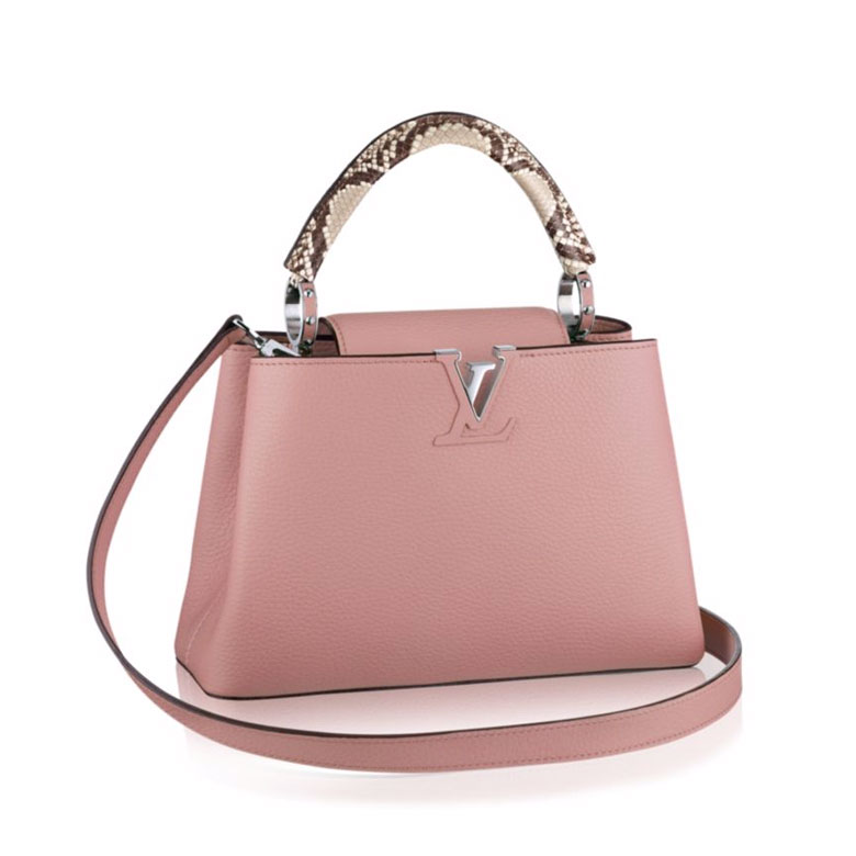 The fashionable mini size of Capucines PM lends an intense pop of contrasting colors to wardrobe styles from classic to daring. Finished with shiny color accents, the Capucines PM comes with a removable shoulder strap for casual shoulder or cross-body wear.