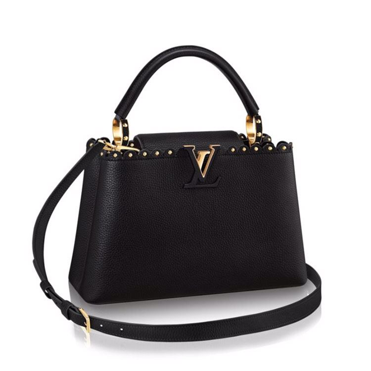 This elegant Capucines PM is softened by a delicate and feminine cut inspired by the lace croquets technique. The chiseled edges, with a precious stud at their center, are inspired by the iconic Monogram Flower and by the nails on historic House Trunks.