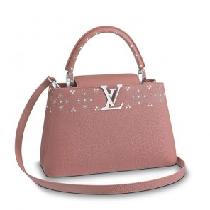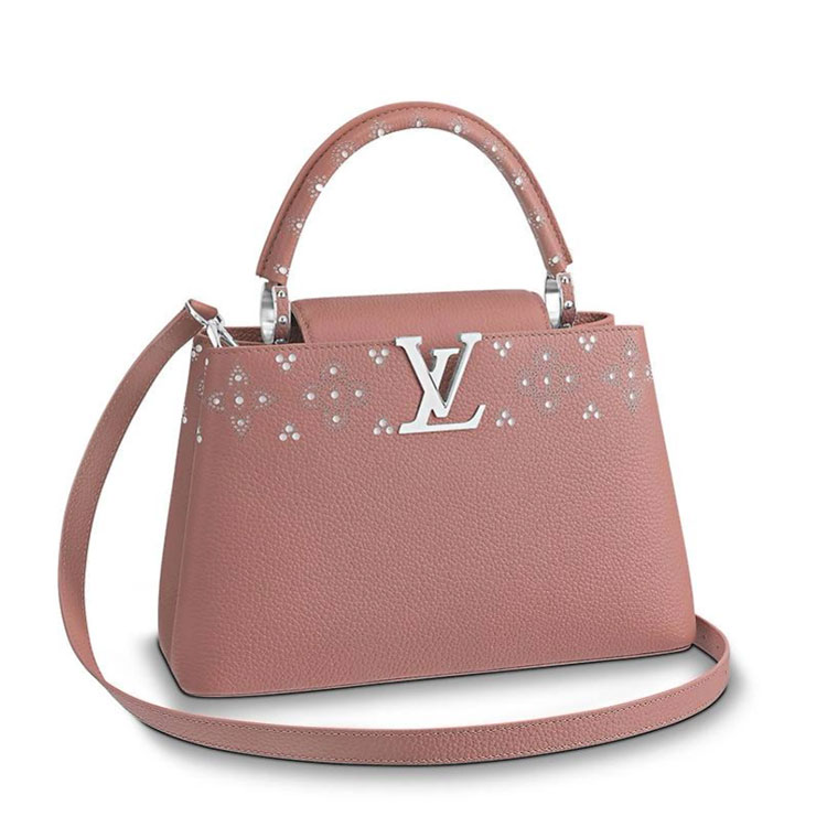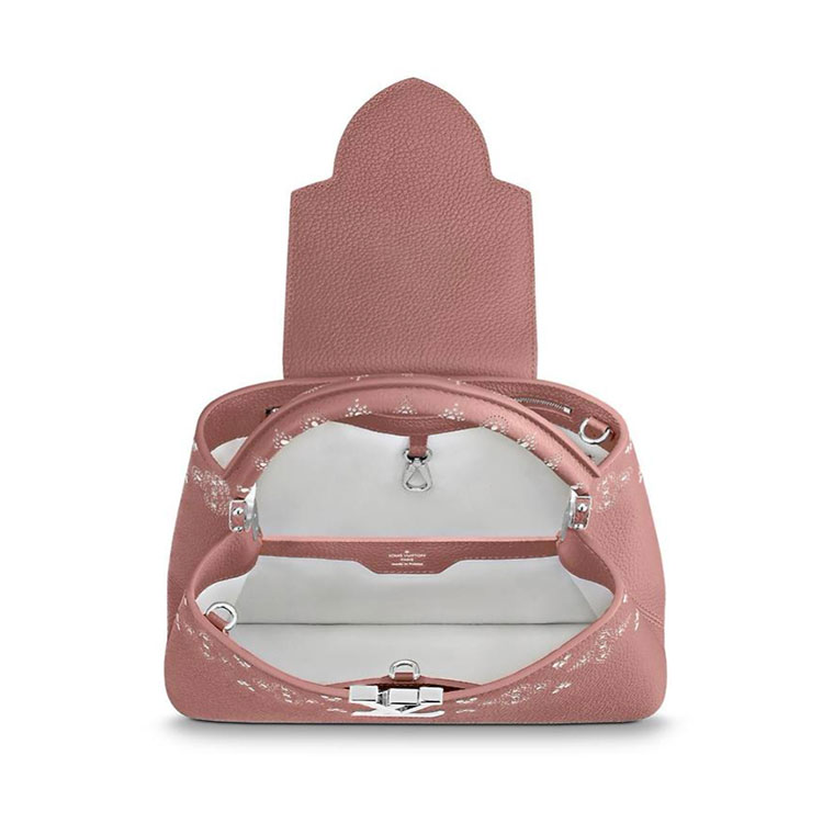 Delicate perforations on the top and handle of the Capucines Sweet Brogues bag, crafted of Taurillon leather, create a Monogram Flower pattern that is enhanced by a contrast backing of light-colored lambskin. This feminine PM model is ideal for daily wear, either carried by hand or worn over the shoulder on its detachable strap.
