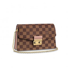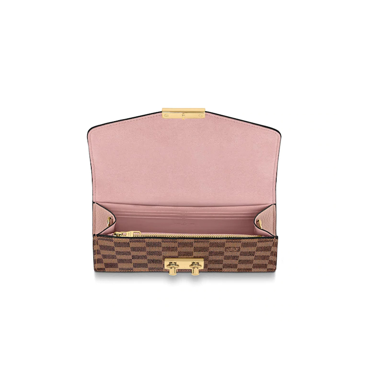 Inspired by the Croisette handbag, the Croisette chain wallet revisits the key codes of its design: the combination of Damier Ebene canvas and colored leather, and the S-lock, historically used on Louis Vuitton trunks. This model features a removable chain, which enables it to be carried on the shoulder or in hand.