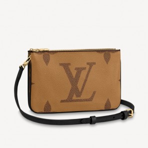 Timeless Monogram and on-trend Monogram Giant Reverse canvas combine on the Double Zip Pochette, which comes with a removable, adjustable leather strap for multiple carry options. This versatile pouch features two zipped pockets to organize everyday essentials, one of which contains three card slots. The middle space offers easy access to items like tickets.