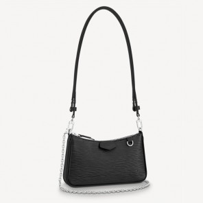 The Easy Pouch on Strap is a sleek design in grained Epi leather, discreetly embossed with the LV Initials. Large enough to hold everyday essentials, this on-trend model is notable for its versatility, featuring a removable chain and a removable, adjustable leather strap for shoulder or cross-body carry. The D-ring on the outside can be used to attach a charm.