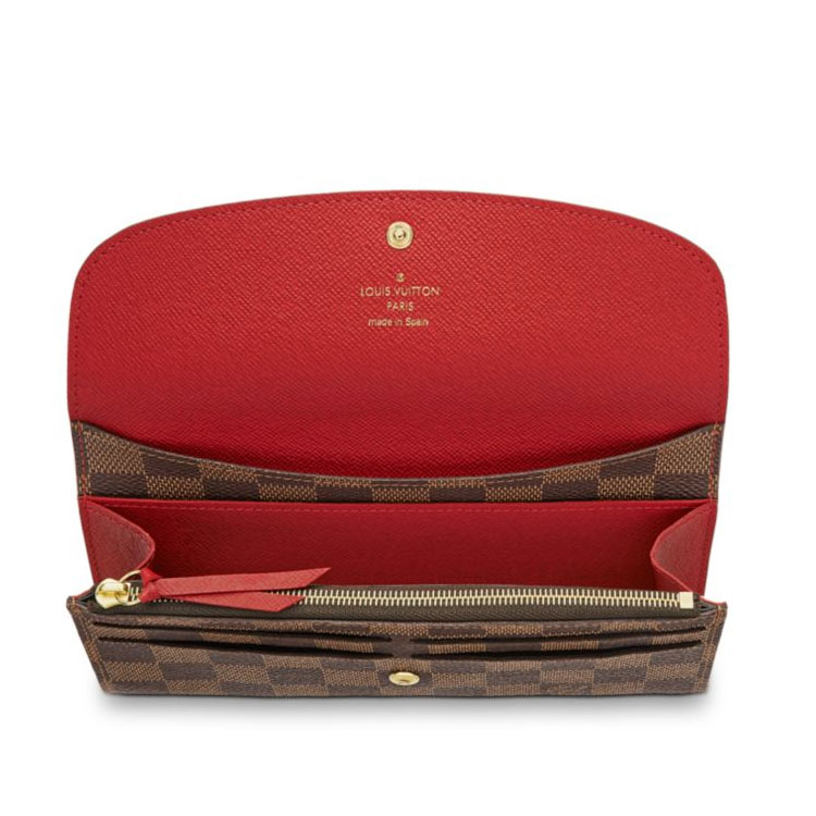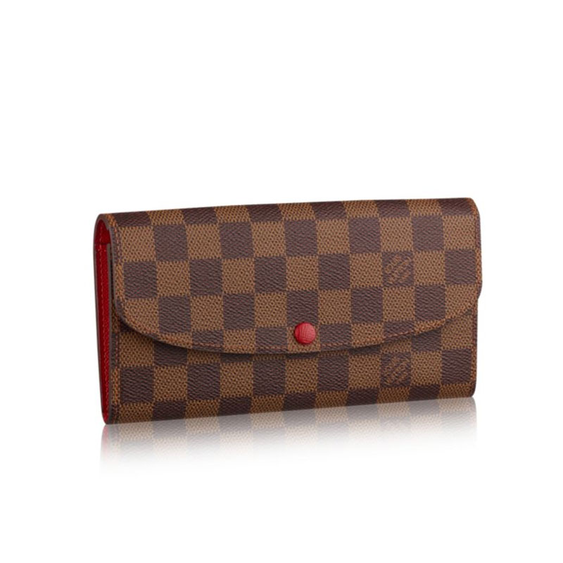 Proving that functionality and beautiful design can go together, the Emilie Wallet is elegance itself in supple Damier Ebene canvas with a fresh lining color. Numerous pockets and an attractive shape make it irresistible.