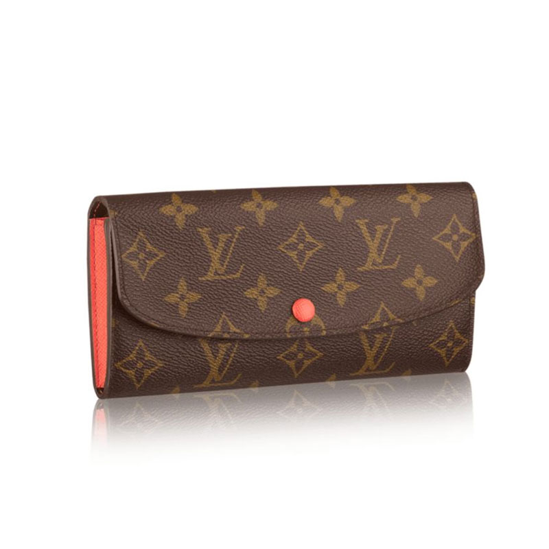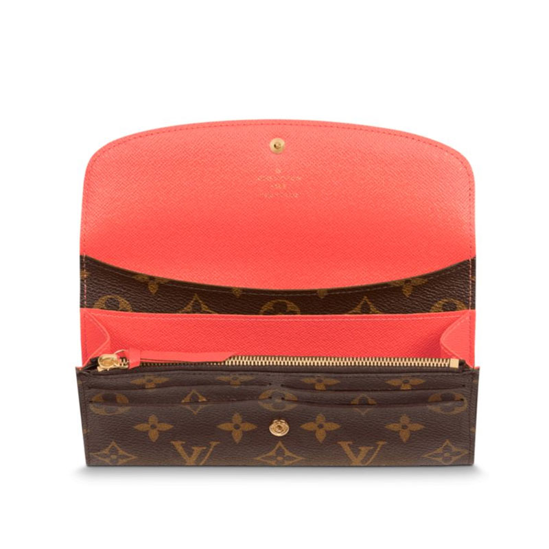 Proving that functionality and beautiful design can go together, the Emilie Wallet is elegance itself in supple Monogram canvas with a fresh lining color. Numerous pockets and an attractive shape make it irresistible.