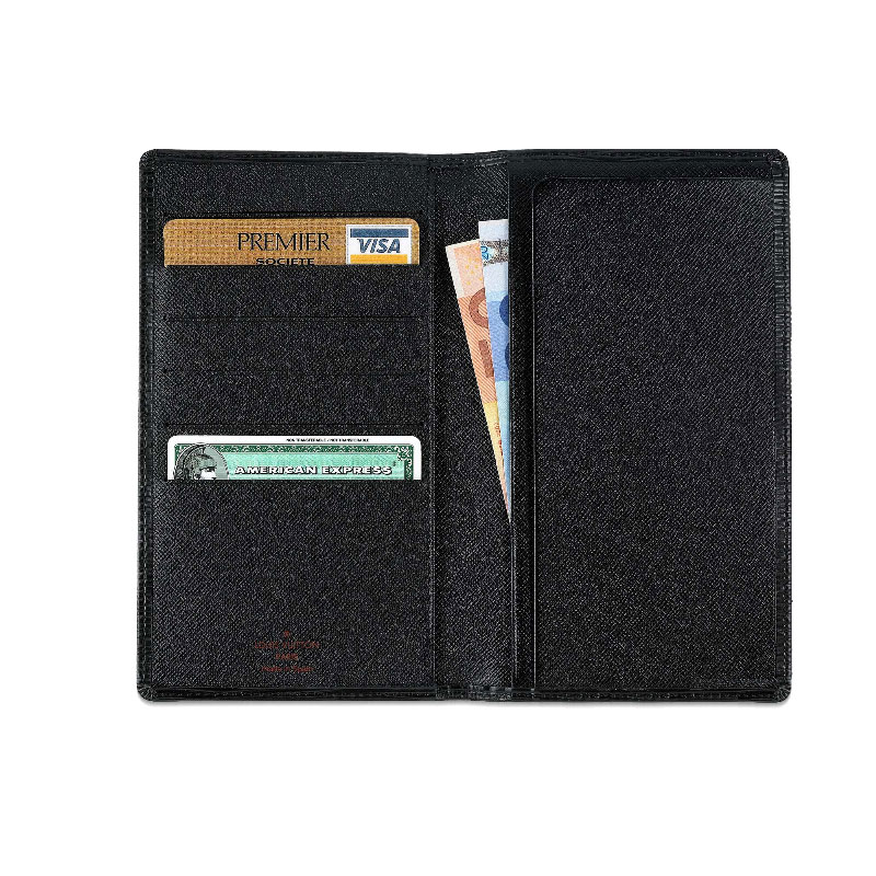 - Six credit card slots, two long slots for receipts, one open slot to hold a checkbook