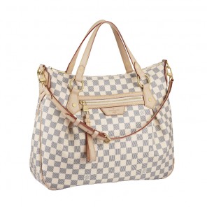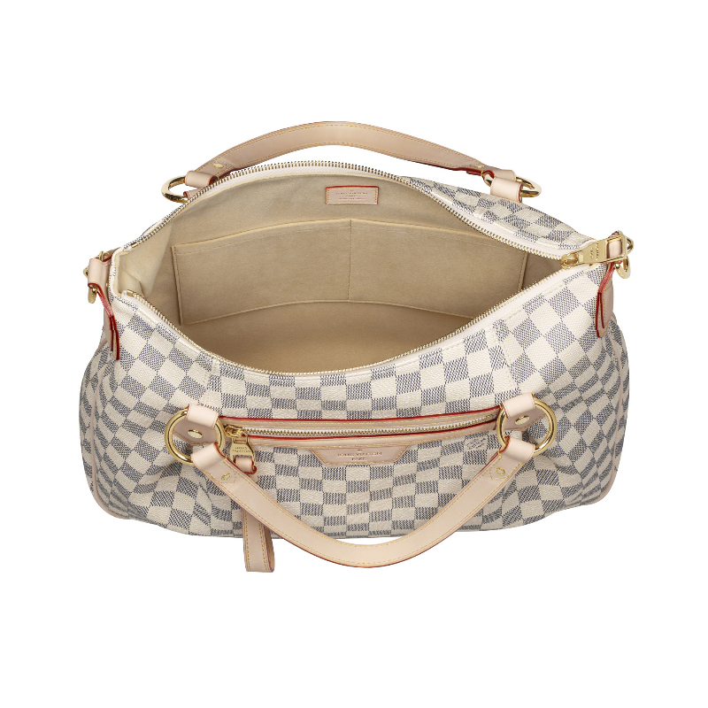 The Evora MM is sophisticated, spacious and chic. Refreshing Damier Azur canvas accentuates its feminine curved shape, while cowhide leather trimmings and rich golden brass pieces add pure refinement.
