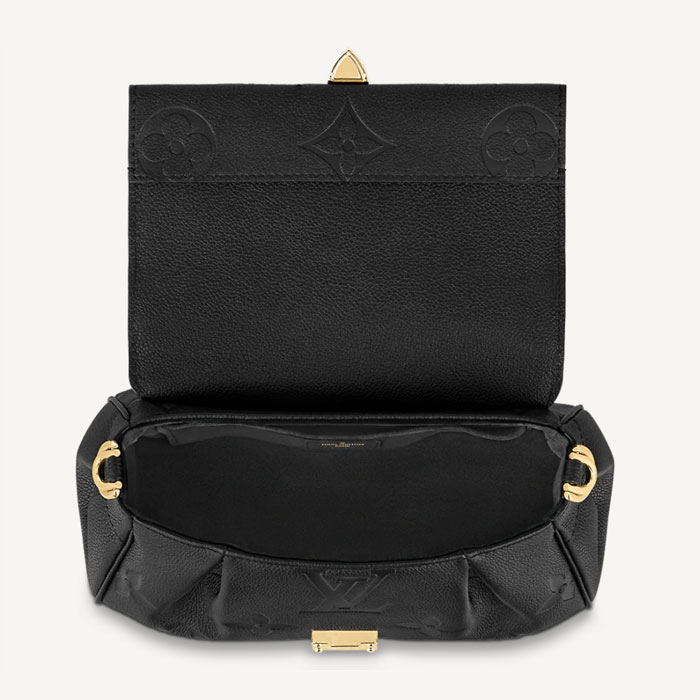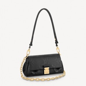 The Favorite is a fashionable baguette shoudler bag made from supple grained leather with an oversized embossed Monogram pattern. Feminine pleats bring a couture touch while the gold-color magnetic lock evokes Louis Vuitton鈥檚 heritage. A removable and adjustable strap enables short-shoulder carry or cross-body wear while a blod detachable gold-color chain allows more glamorous evening use.