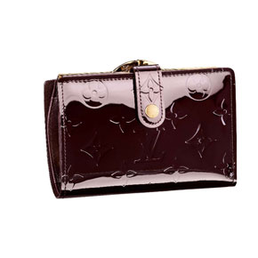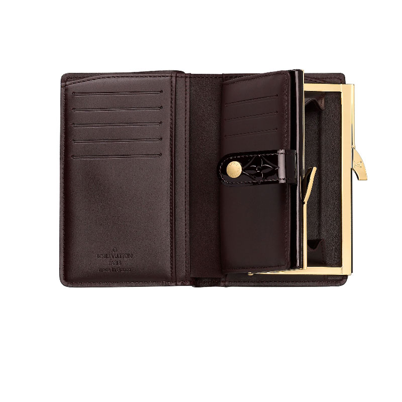 This wallet in Monogram Vernis leather features four credit card slots, one closed change compartment and a compartment for bills and papers.
