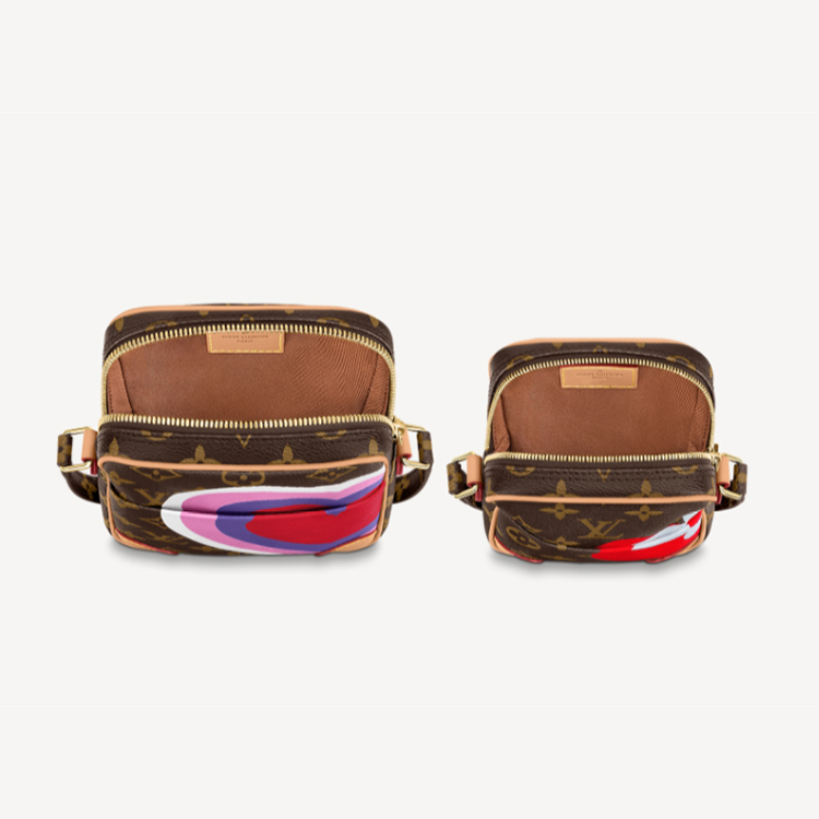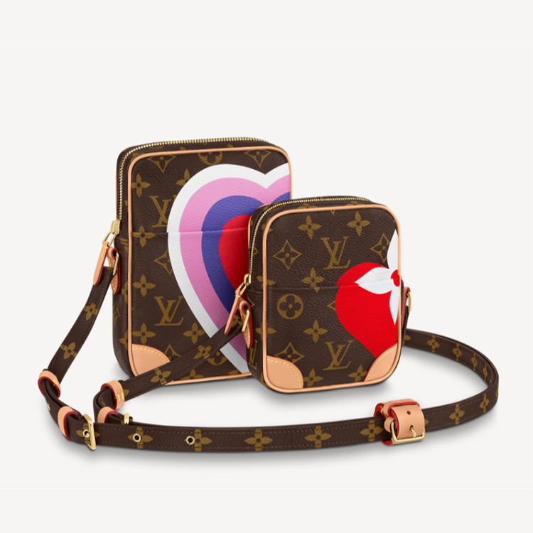 The Paname Set is a set of two small bags connected by a strap that holds them together. Fashioned from Monogram Canvas with large colorful prints of hearts and Monogram Flowers, it鈥檚 part of the Game On capsule collection for Cruise 2021. Both bags have outside pockets and adjustable straps in Monogram canvas.