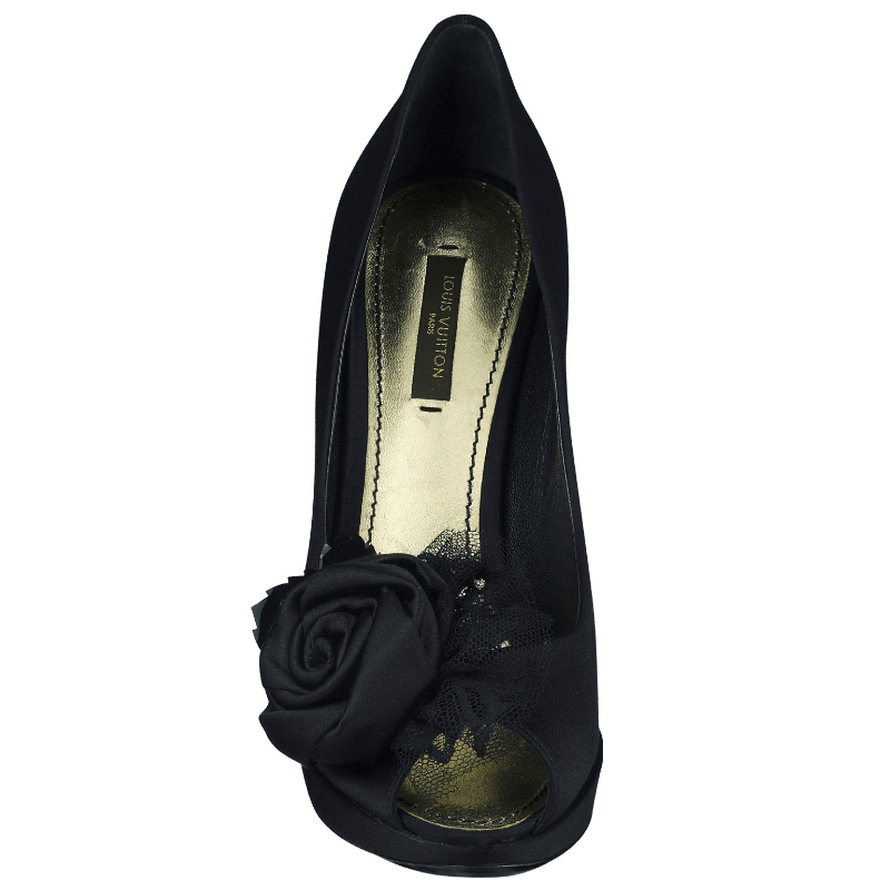 A satin rose with a black patent leather leaf and LV-embroidered lace flounce is a pretty, feminine detail on these sophisticated satin platform pumps with a peep toe and graceful stiletto heel.