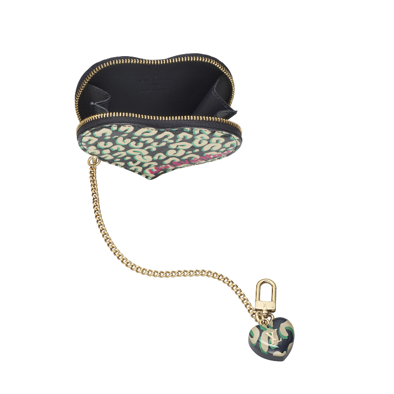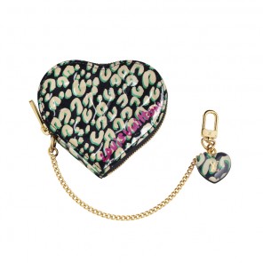 Vivid colours, an iconic print and a romantic shape all add to the unique charm of the Heart Coin Purse Leopard. With golden brass pieces and in daring Monogram Vernis Leopard, it embodies punk chic.